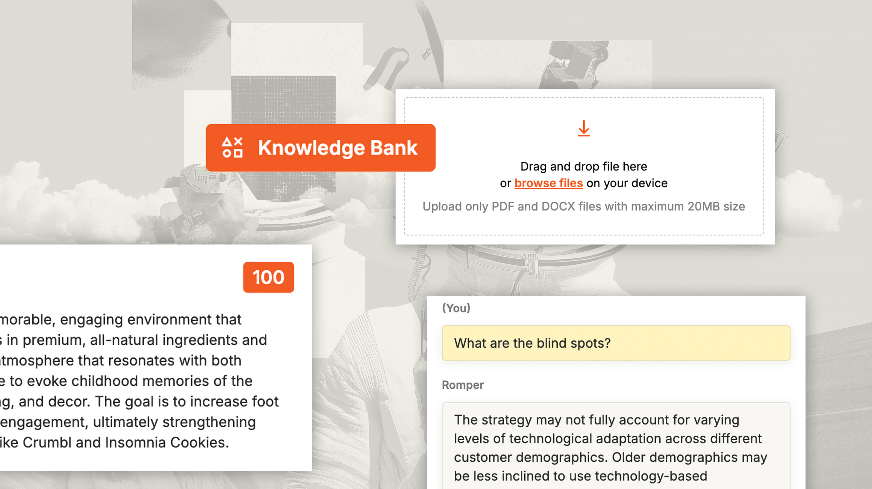 For small, fast-moving teams inside large organizations who need to create high-quality, on-brand content quickly—without the endless back-and-forth. Romper helps reduce approval bottlenecks, align work to strategy, and eliminate wasted cycles by bringing feedback and validation into the flow.